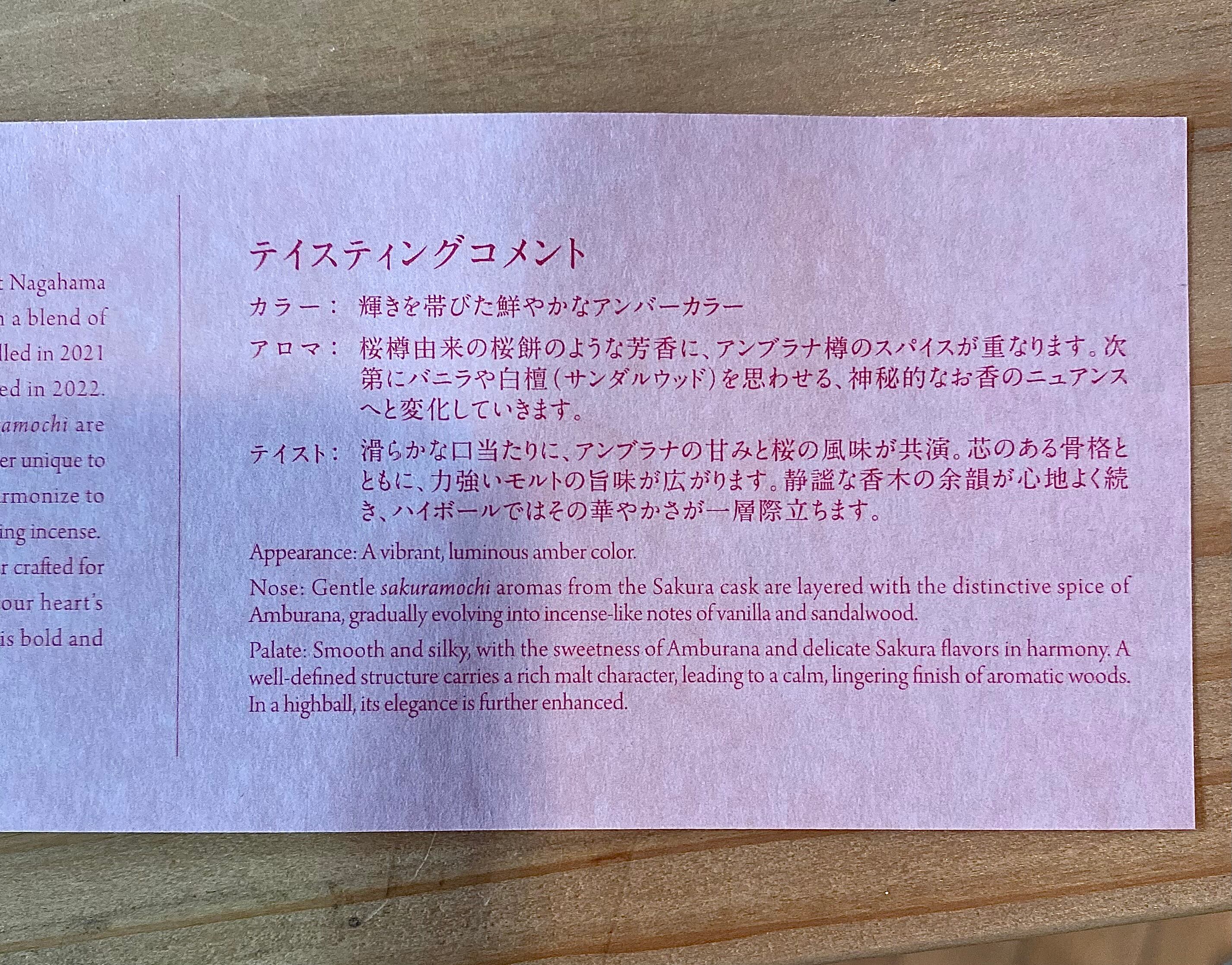 テイスト:滑らかな口たりの中に、アンブラナのエスニックな甘みと桜の繊細な風味が共演します。芯の通った骨格があり、中盤からは強いモルトの旨味が広がります。余韻は非常に長く、静謐な香木の印象が心地よく持続します。